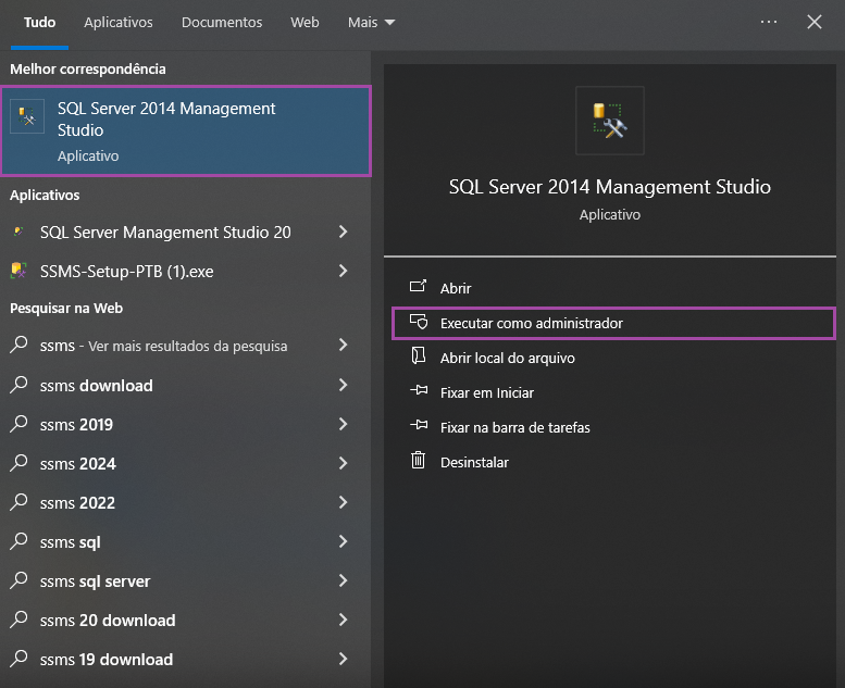 2- Acesse o menu Iniciar > Digite: Sql Server Management Studio ou SSMS e execute como administrador