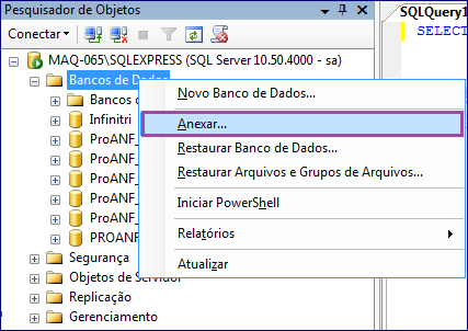 Procedimentos para anexar a Base (Usando Sql Server Management Studio)