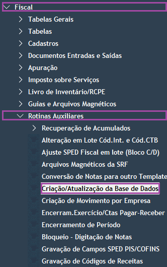 1- Acesse: Fiscal > Rotinas Auxiliares > Criação/Atualização da Base de Dados