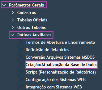 1- Acesse: Parâmetros Gerais > Rotinas Auxiliares > Criação/Atualização da Base de Dados