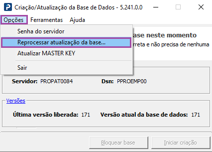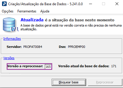 3- Digite a versão da base que deseja reprocessar. Neste exemplo, a versão selecionada foi a 165.