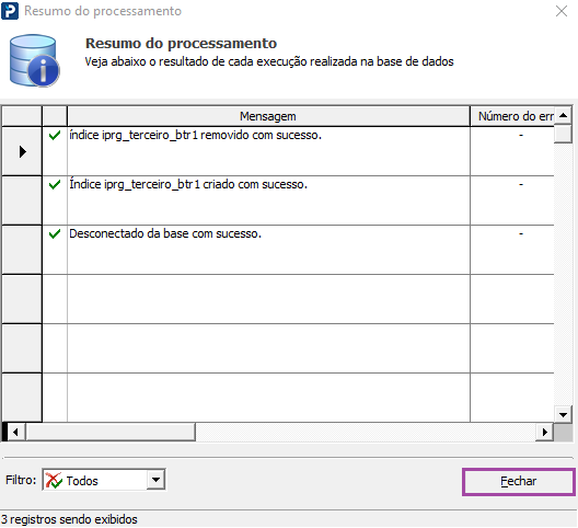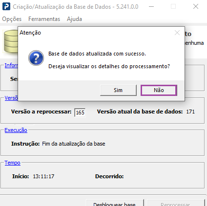 7- Aguarde até que o reprocessamento crie e atualize as tabelas dos Parâmetros Gerais. Clique em Não caso não queira visualizar os detalhes