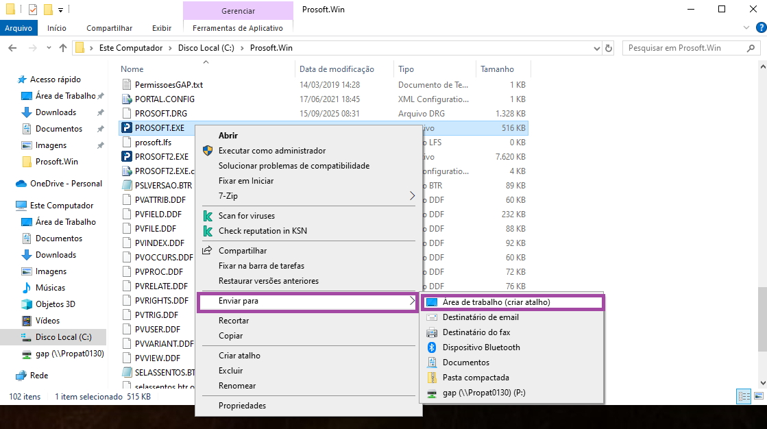 4- Clique com o botão direito em cima do arquivo PROSOFT.EXE > Enviar para > Área de trabalho (criar atalho).