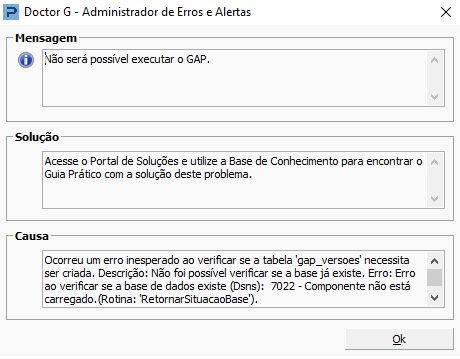 Não será possível executar o GAP. Ocorreu um erro inesperado ao verificar se a tabela 'gap_versoes' necessita ser criada. Descrição: Não foi possivel verificar se a base já existe. Erro: Erro ao verificar se a base de dados existe (Dsns): 7022 - Componente não está carregado. (Rotina: RetornarSituacaoBase). Referência / Erro: 48300016 / 105994.