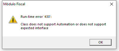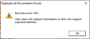 Motivo: 430 - Class does not support Automation or does not support expected interface Referência/Erro: 15700036 |