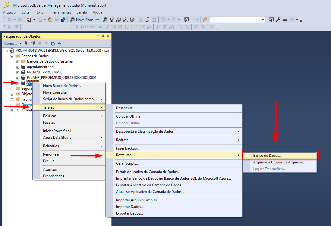 1- No SQL Management Studio, logado na instância, clique com o botão direito sobre a database e acesse em Tarefas > Restaurar > Base de Dados.
