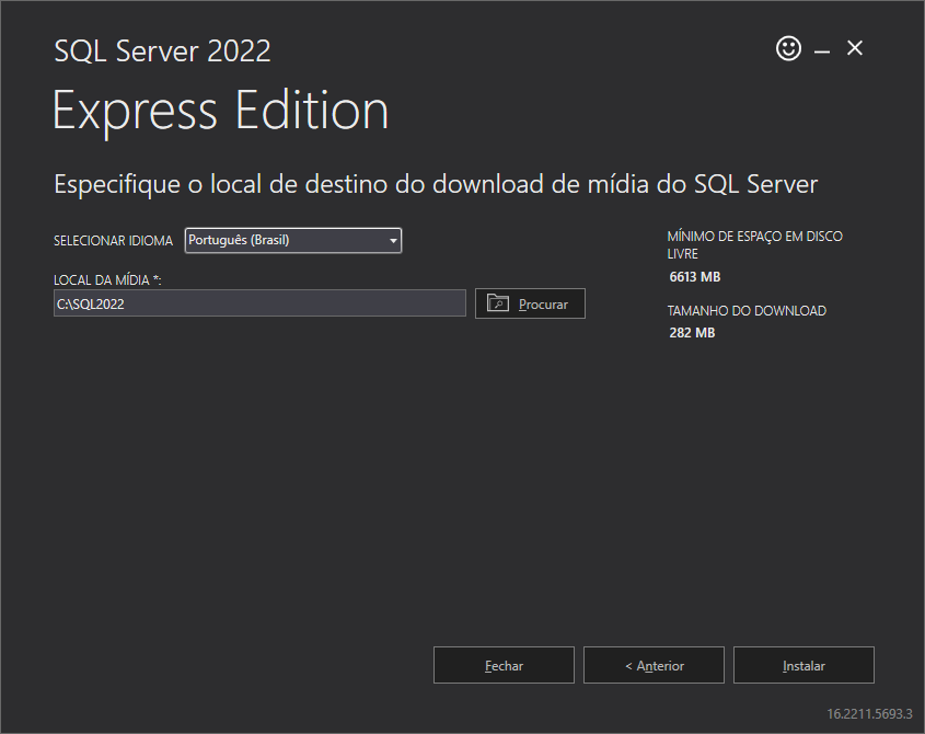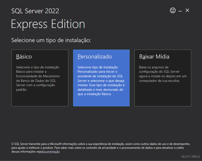 Baixe o setup de instalação do SQL Express na versão 2022 e selecione a instalação Personalizado