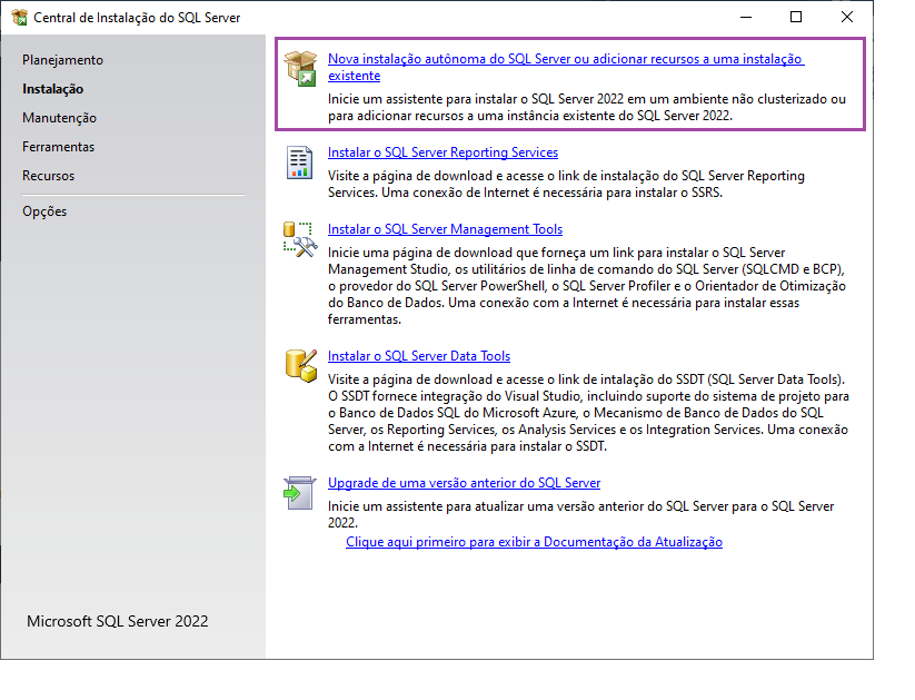 Selecione em Nova Instalação autônoma do SQL Server ou adicionar recursos a uma instalação existente.