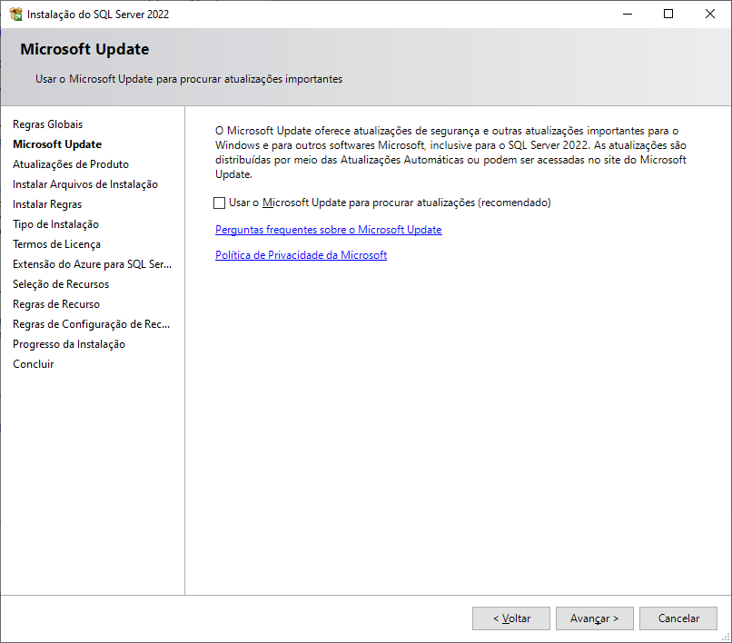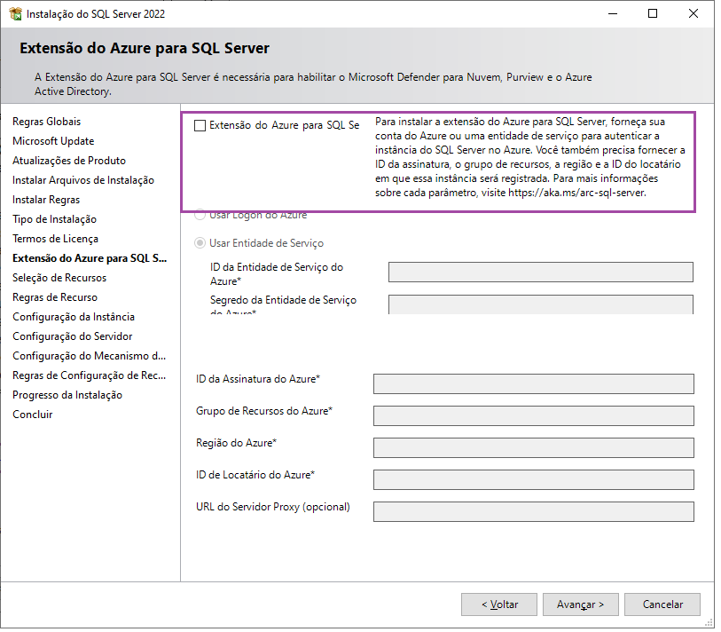 Remova a seleção da opção de Extensão do Azure para SQL Server e clique em Avançar.