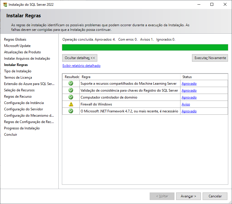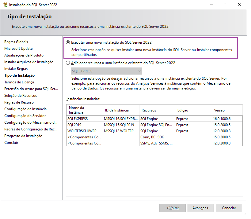 Selecione a opção: Executar uma nova Instalação do SQL Server 2022, clique em Avançar