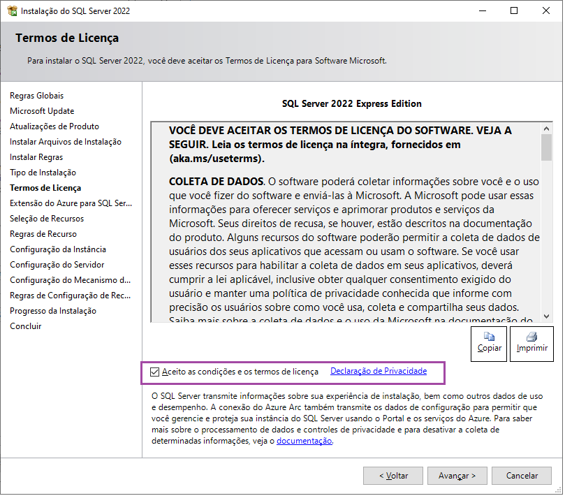 Clique em Aceito as condições e os termos de licença e Avançar