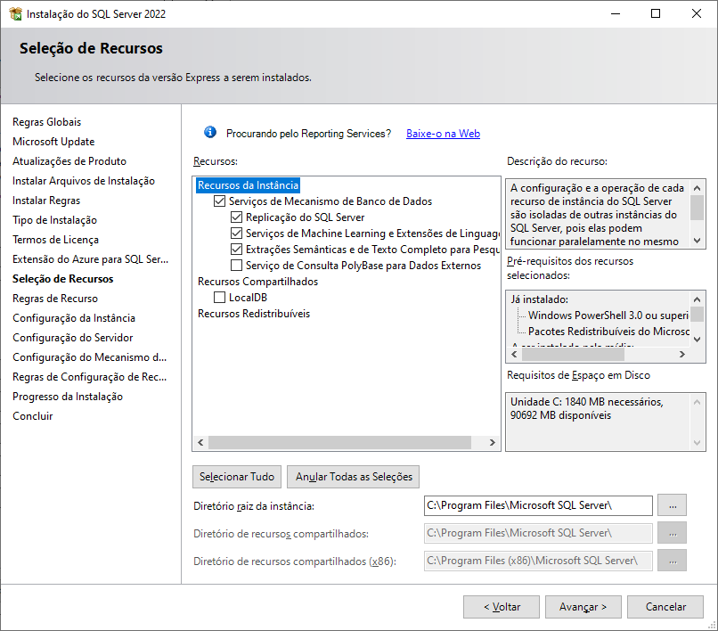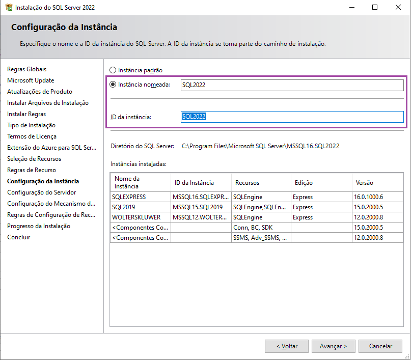 Clique em Instância nomeada e informe o nome da instância. Neste exemplo, foi dado o nome de SQL2022. Clique em Avançar.