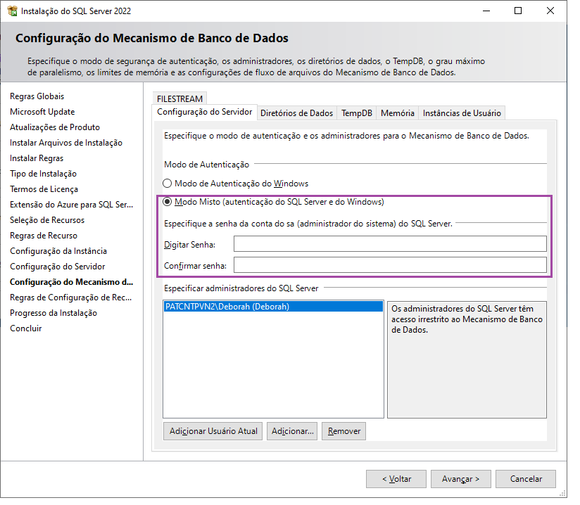 Para Autenticação, clique em Modo Misto e informe a senha para acesso com o usuário SA. Clique em Avançar.
