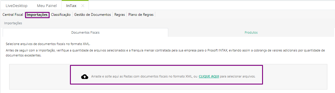 4 - Para importar os arquivos e soltar as pastas com o documentos fiscais ou Selecionar os arquivos em Clique aqui .