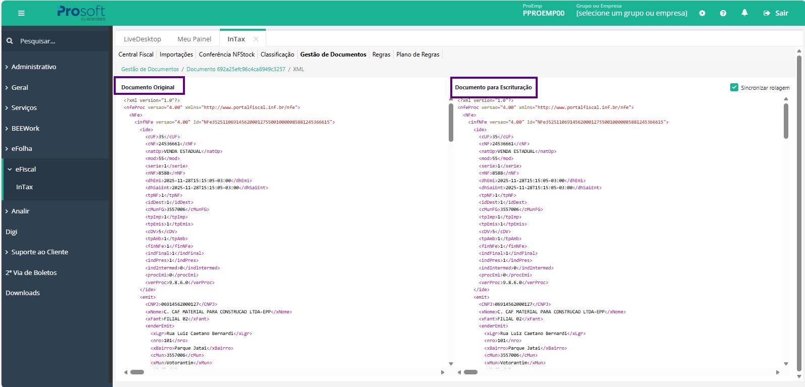 7 - Será apresentada a visualização do XML Original (importado) e o XML alterado (com a aplicação das regras na Gestão de Documentos).