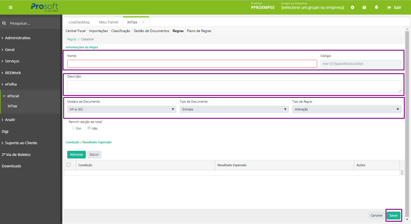 Importante: Para regras plenamente funcionais é necessário cadastrar as Condições das Regras.