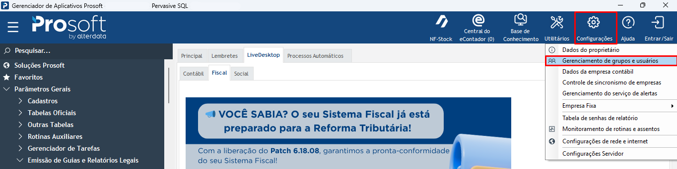 Com o Sistema Prosoft aberto vá em Configurações > Gerenciamento de Grupos e Usuários.
