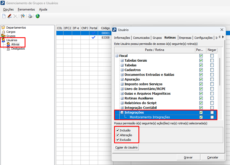Com o usuário aberto, acesse a aba Rotinas, na opção Fiscal > Integrações > Monitoramento Integrações, habilite a rotina e definas as permissões de acesso.