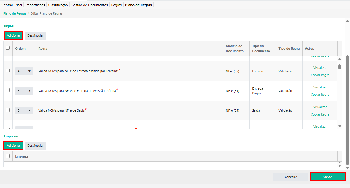 Importante: No campo de Regras, além de adicionar é importante definir a prioridade das Regras. No campo Empresas, somente empresas que não constam em nenhum outro Plano de Regras será apresentado para seleção.