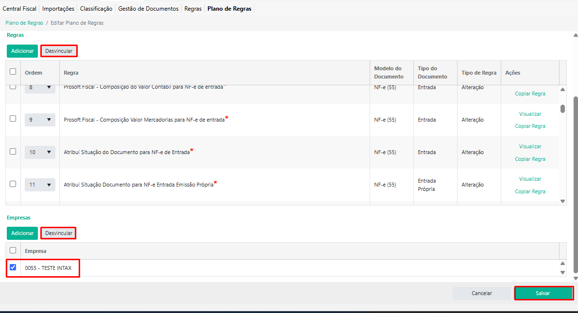 4 - O processo de vínculo e desvinculo de regras e empresas é exatamente o mesmo, tanto no processo de cadastramento quanto na edição do Plano de Regras.