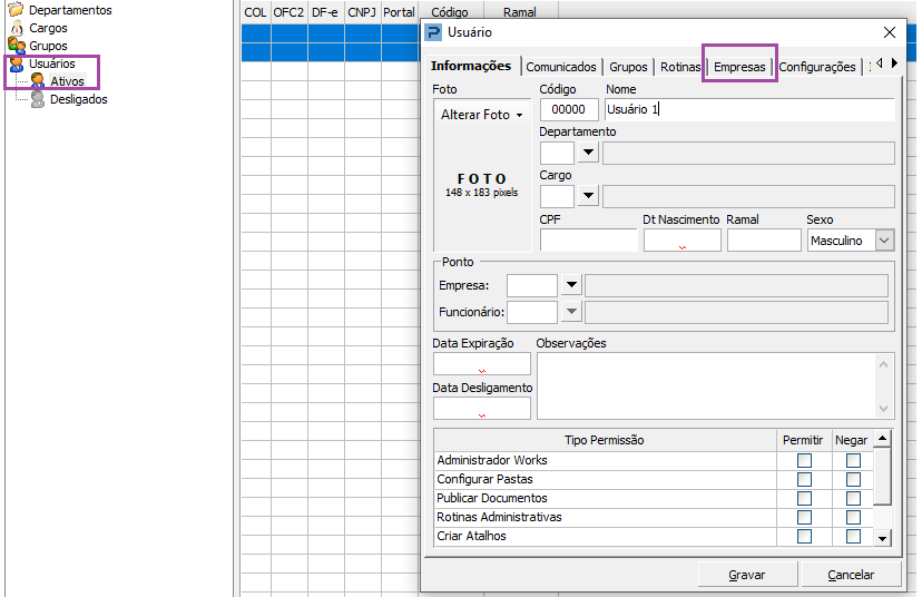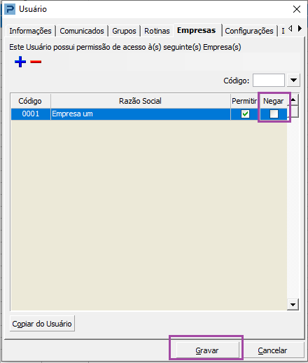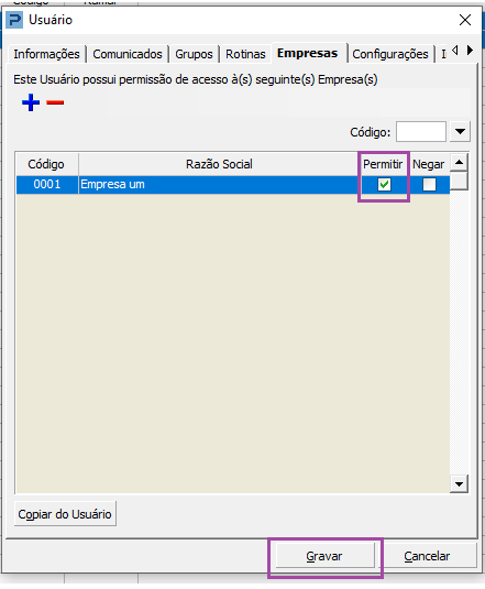 4 - Após isto, acesse novamente o usuário e a empresa (selecionados no passo anteriores) e modifique a permissão para o campo "Permitir" e selecione gravar: