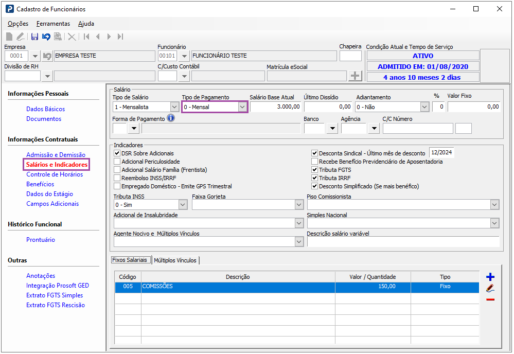 2 - Na aba Salários e Indicadores verifique se o Tipo de Pagamento está preenchido como (0) Mensal.