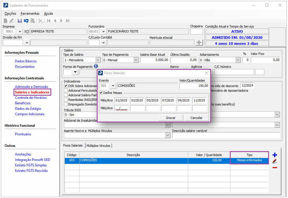 3 - Verifique se o Fixo Salarial está com o Tipo: "Meses informados", pois estando dessa forma será necessário identificar se o mês de geração do Recibo de Pagamento está preenchido.
