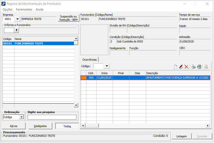 2 - Verifique se o Funcionário em questão possui um Afastamento sem Data Final.