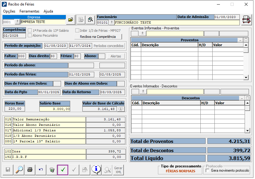 Neste caso, há Recibo de Férias processado e salvo, porém não liberado.
