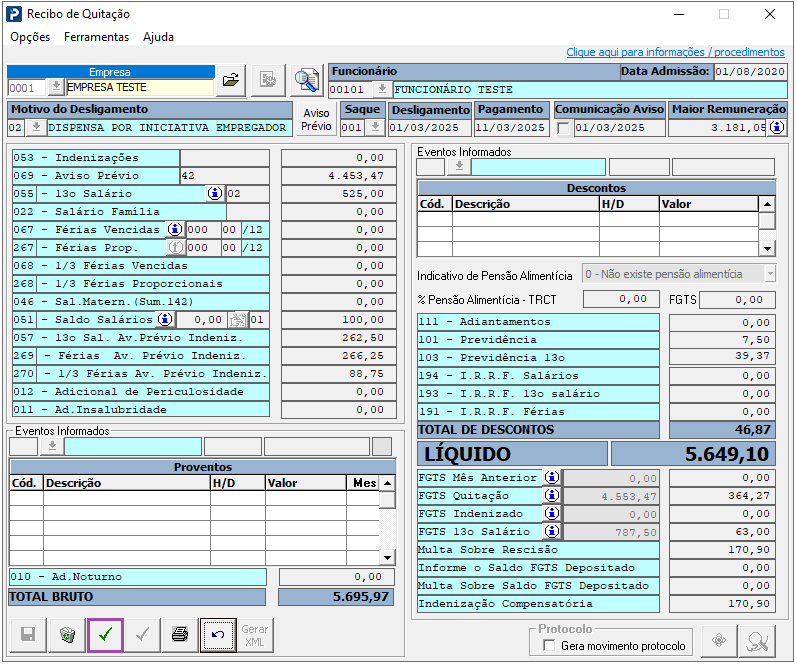 Neste caso, há Recibo de Quitação processado e salvo, porém não liberado.