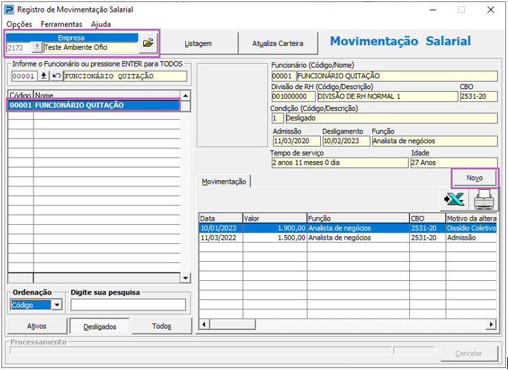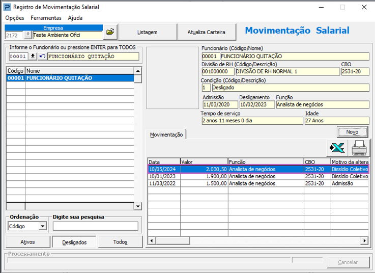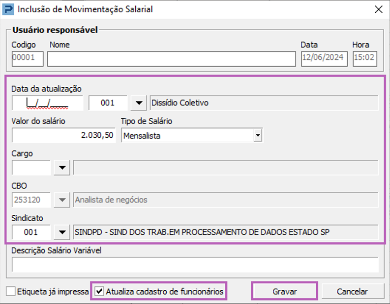 4- É demonstrada uma nova tela para inclusão de Movimentação Salarial, preencha a data da atualização (com a data Base do Dissídio), valor do Salário e Motivo da Alteração Salarial;