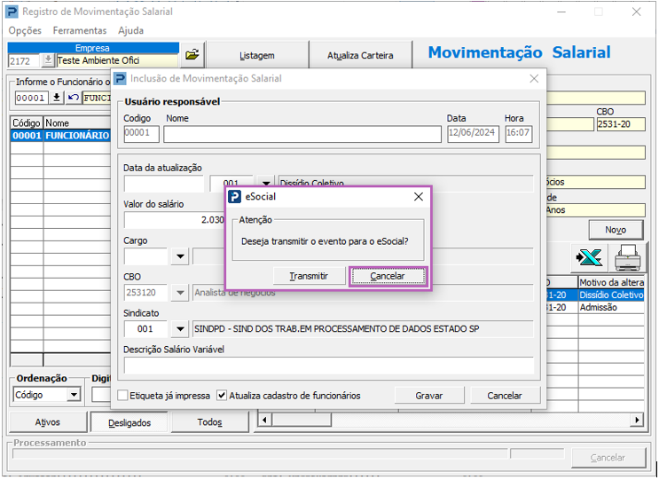7- Ao gravar o novo salário será demonstrado a mensagem de transmissão ao e-Social, clique em Cancelar.