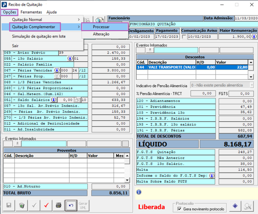 2- Selecione o Menu Opções > Quitação Complementar > Processar