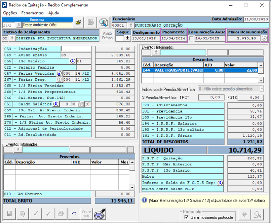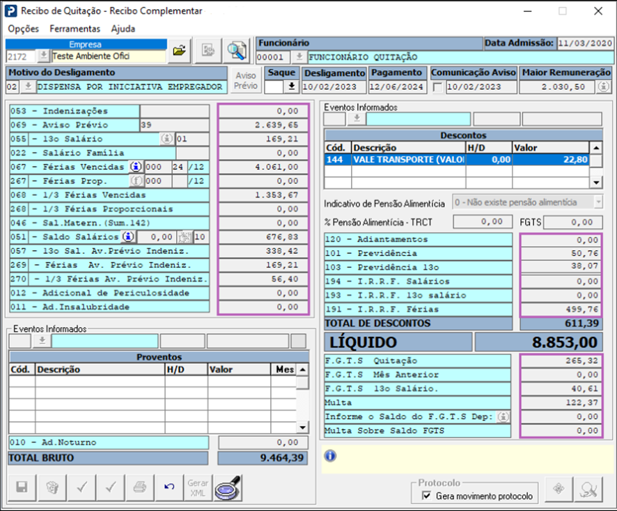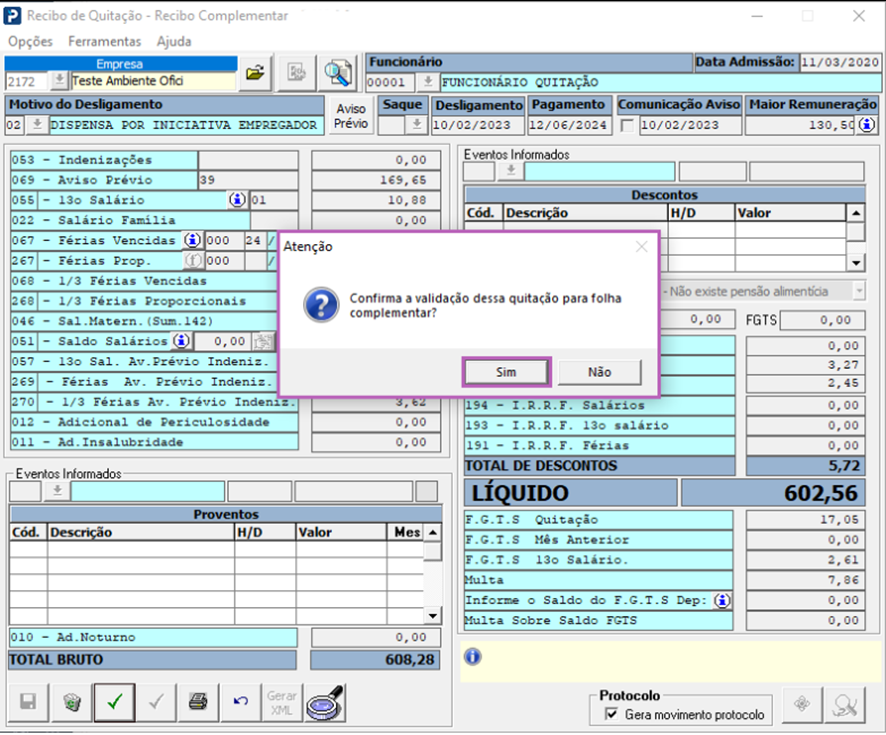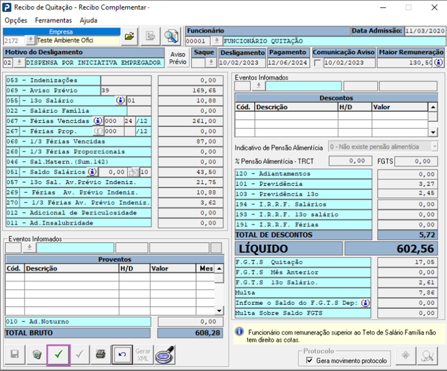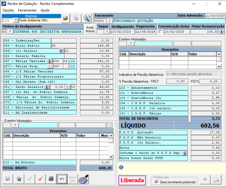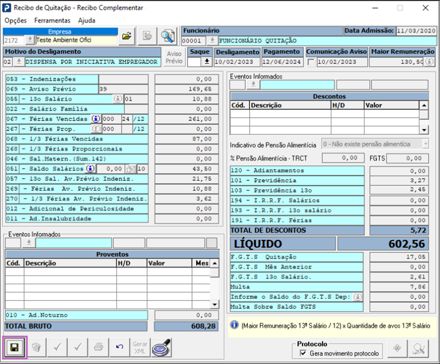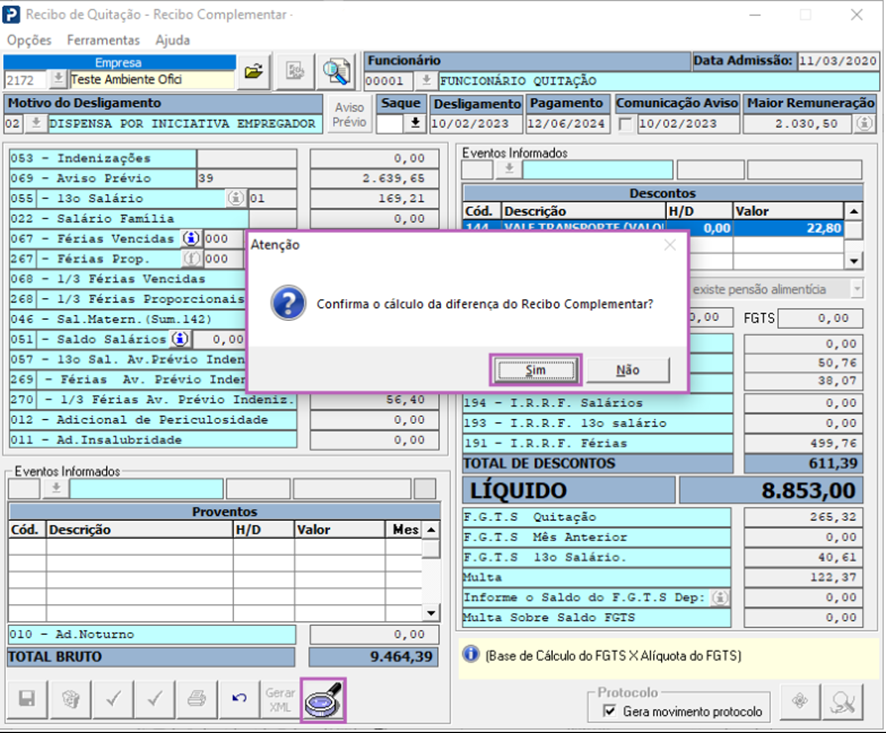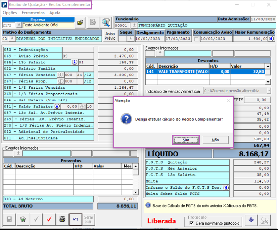 6- Todos os campos do Recibo de Quitação Complementar são recalculados de acordo com o valor do novo salário: