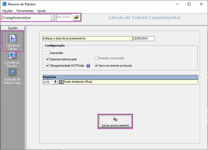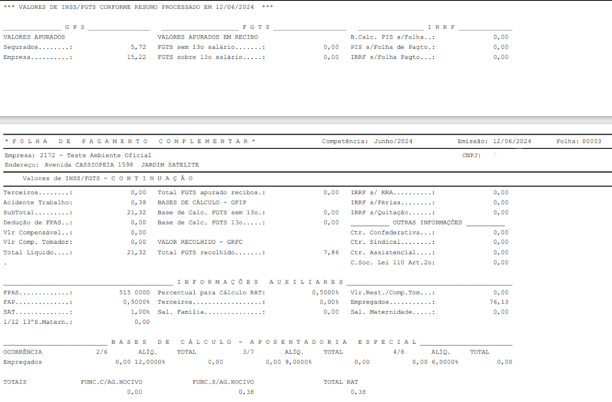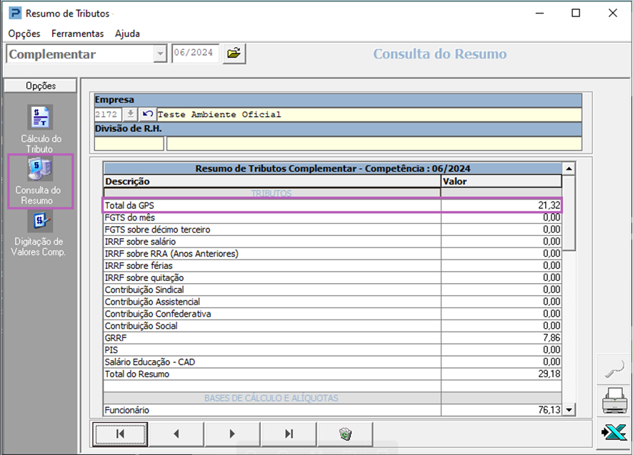 1-Acesse Social Folha de Pagamento > Processamentos > Folha Complementar > Resumo de Tributos