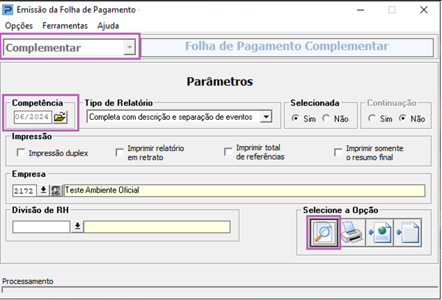 1- Acesse Social > Folha de Pagamento > Processamentos > Folha Complementar > Emissão da Folha de Pagamento