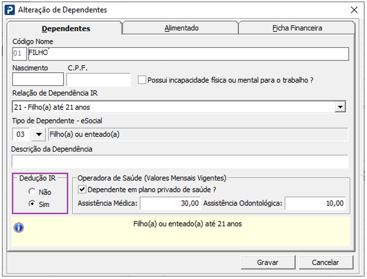 3- Verifique se o dependente cadastrado possui dedução de IRRF.