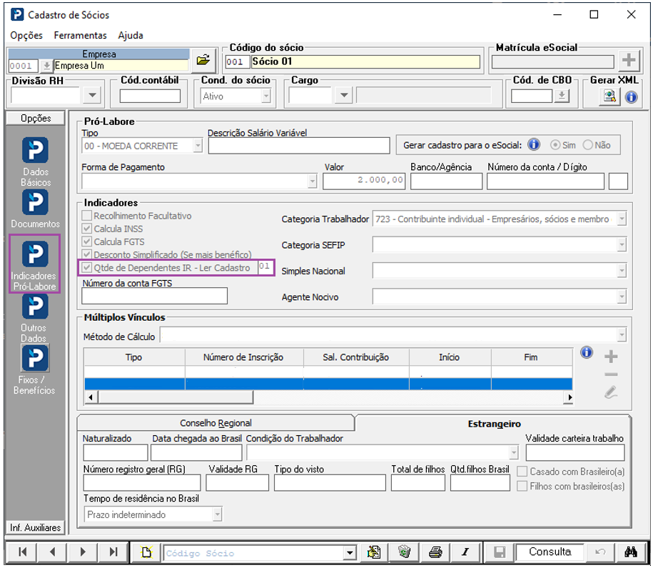 1- Acesse: Social > Controle de Sócios > Manutenção de Arquivos de Sócios > Cadastro de Sócios > Guia Indicadores Pró-Labore.