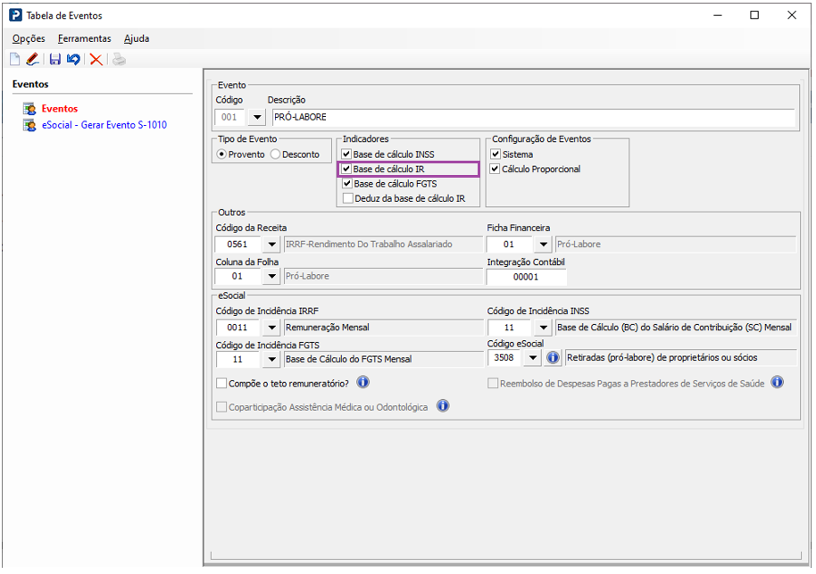 2- Confirme se o Evento 001 - Pró-Labore está corretamente parametrizado, usando a imagem de referência.