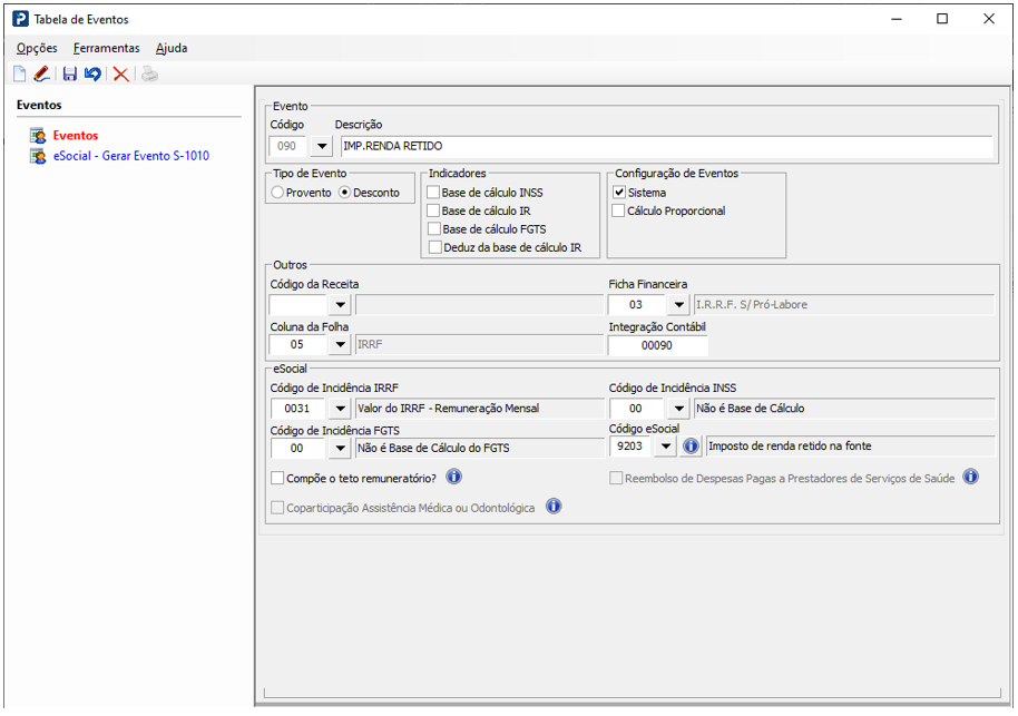 3- Faça o mesmo para o Evento 090 - Imp. Renda Retido, verificando sua parametrização conforme a imagem indicada.