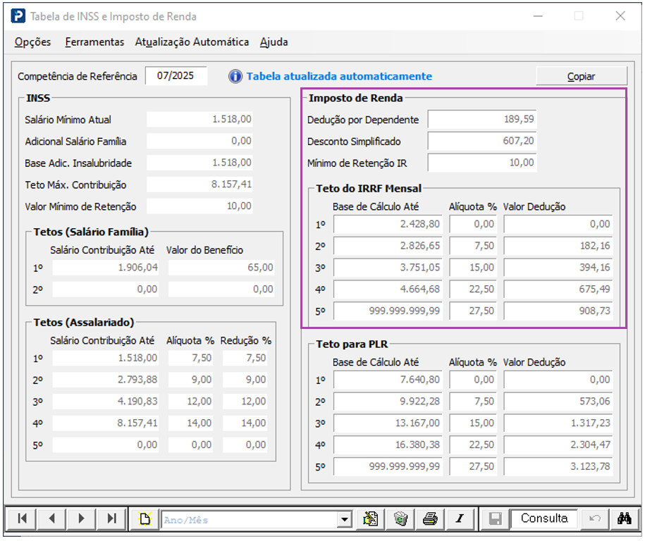 1- Acesse: Parâmetros Gerais > Tabelas Oficiais > Tabelas Trabalhistas > Tabela de INSS e Imposto de Renda.