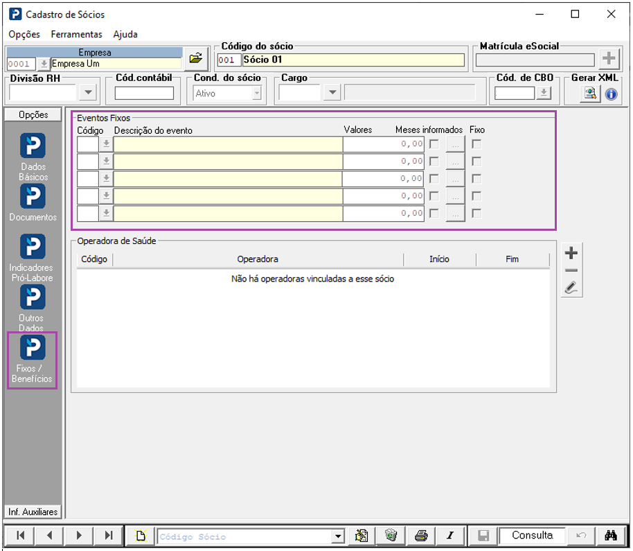 1 - Acesse: Social > Controle de Sócios > Manutenção de Arquivos de Sócios > Cadastro de Sócios > Guia Fixos / Benefícios.
