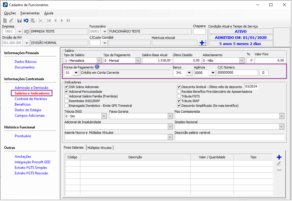 2 - Na aba Salários e Indicadores é necessário que as informações referente a Forma de Pagamento do Funcionário estejam devidamente preenchidos.