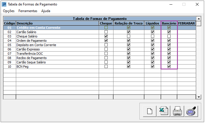1 - Acesse: Social > Folha de Pagamento > Tabelas > Tabelas Auxiliares > Tabelas de Formas de Pagamento