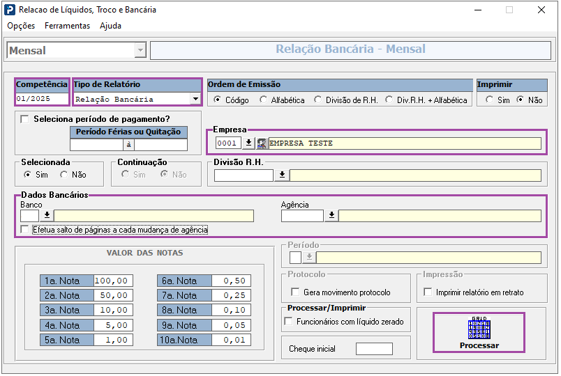 1 - Acesse: Social > Folha de Pagamento > Relatórios do Recibo > Relação de Líquidos, Troco e Bancária