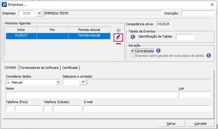 Observação: Para que não sejam mais transmitidos Eventos S-1010 (Tabela de Rubricas) para a Empresa sem movimento, caso haja alguma retificação na Tabela de Eventos, recomendamos informar que a fase de entrega dos Eventos ao eSocial não esteja ativa conforme ilustração abaixo.