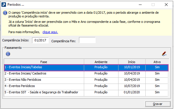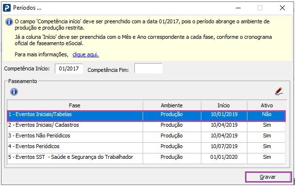 4- Será apresentada uma nova tela com os períodos e faseamento do eSocial