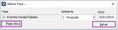 6- Desmarque a opção de Fase Ativa e salve a alteração realizada: