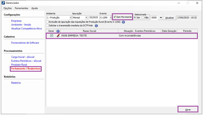 9- Na Aba Fechamento / Reabertura, selecione a opção (checkbox) sem movimento, antes de gerar o Evento S1299 de Fechamento: