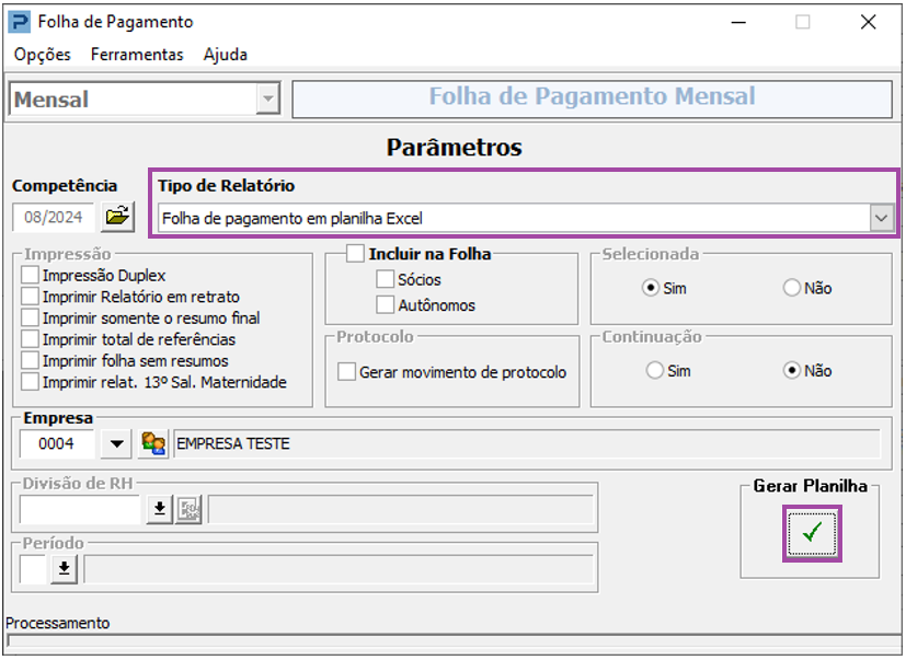 Obs.: Para estes modelos, não será impresso um Relatório e sim gerada uma planilha em Excel, contendo todos os funcionários que foram processados na empresa e todos os eventos com seus respectivos valores. Não será inclusos sócios e autônomos.